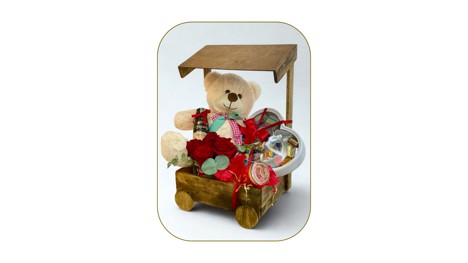 Peluche con lazo, rosas rojas y una selección de chocolates y bebidas en una carretilla de madera rústica.