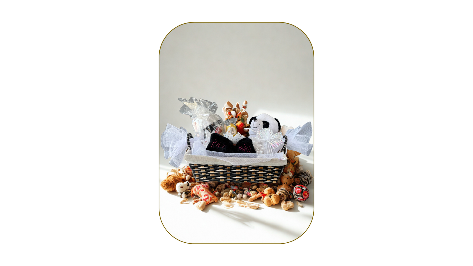 Canasta con osito, dulces variados y licor en miniatura, acompañada de decoración en tonos cálidos.