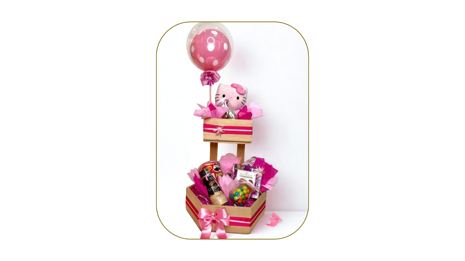 Una ancheta única en dos niveles con peluche, dulces variados, globos y detalles en tonos rosados. Ideal para cumpleaños, aniversarios o días especiales.
