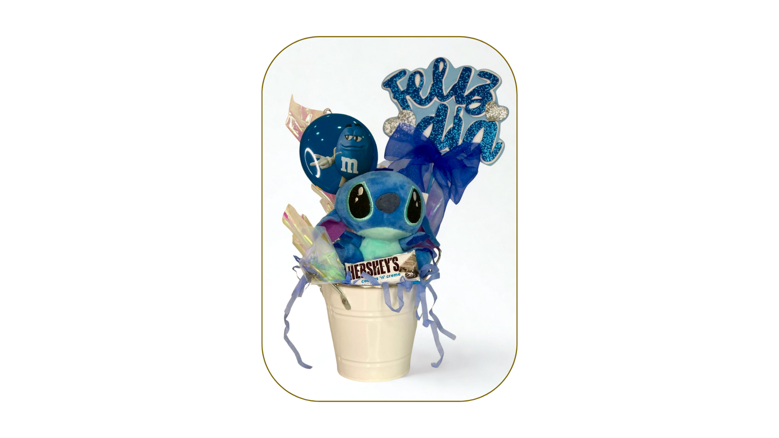 Peluche de Stitch con chocolates Hershey’s, globos y detalles azules en un balde decorativo.