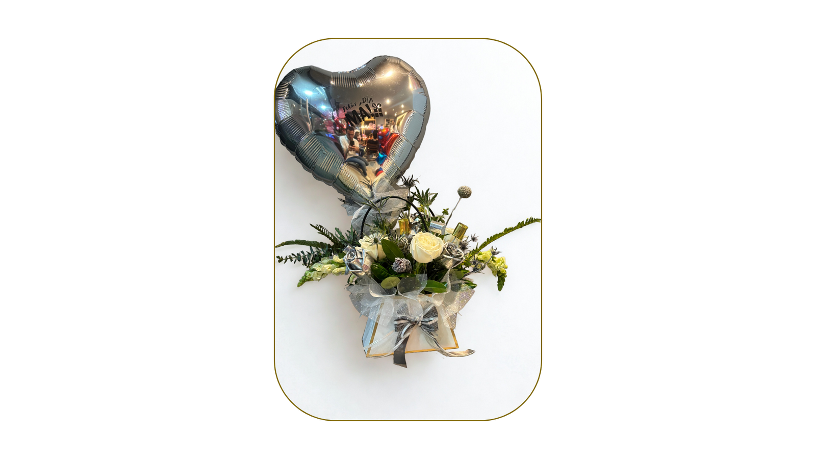 Flores elegantes en tonos blancos y verdes acompañadas de un globo corazón plateado. Perfecto para transmitir elegancia y buenos deseos. Personalizable en diseño y combinación de flores.